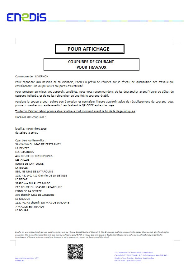 COUPURE DE COURANT LE JEUDI 27 NOVEMBRE 2025 DE 13H30 À 16H30