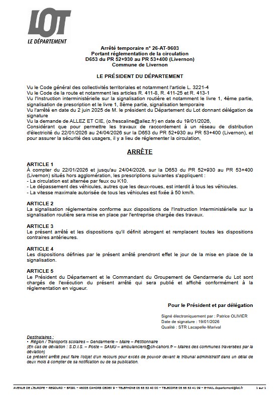 ARRETE TEMPORAIRE N° 26-AT-9603 COMMUNE DE LIVERNON RD 653