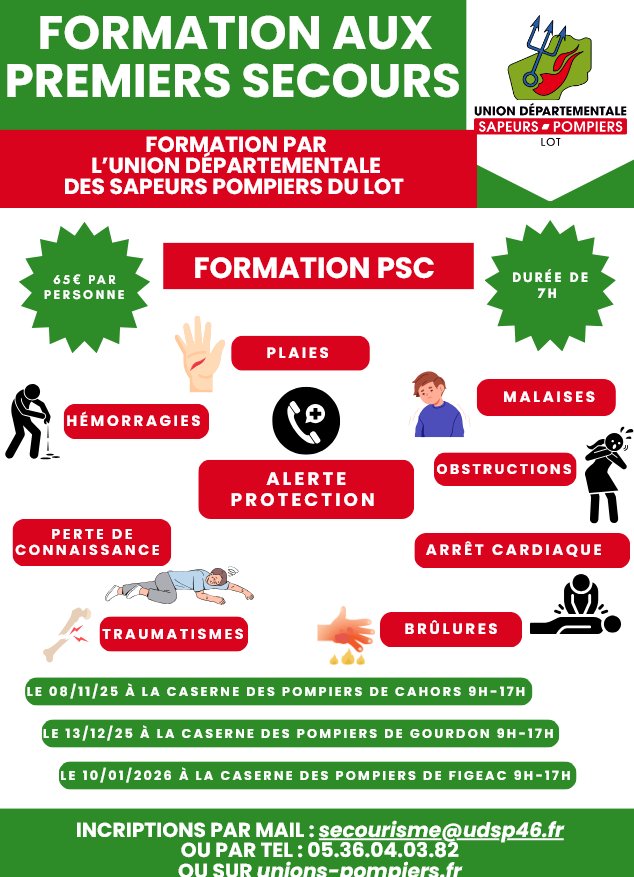 Les inscriptions se font par mail à secourisme@udsp46.fr ou sur le site unions-pompiers.fr