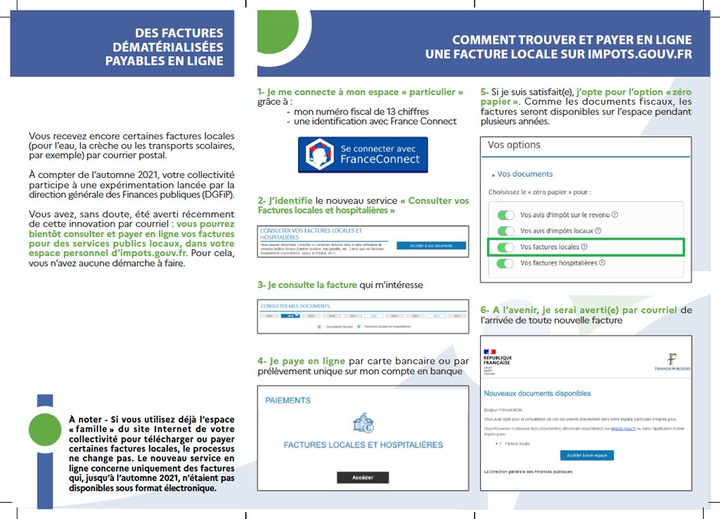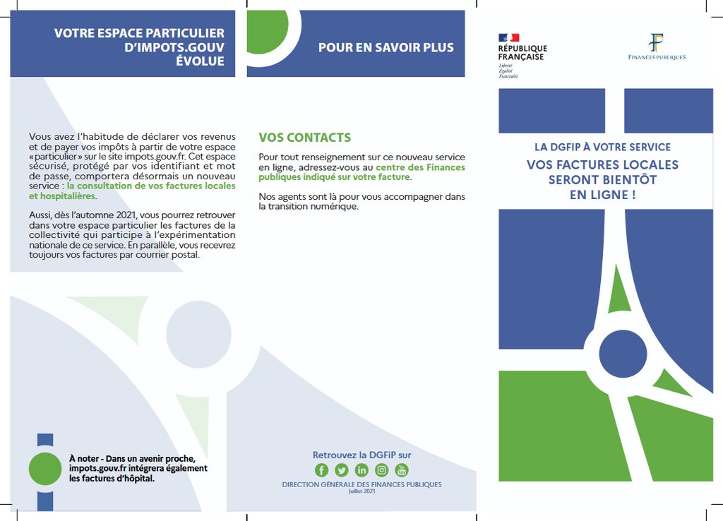 "Mon espace particulier"devient "Mon espace Finances publiques", sur lequel vous pourrez retrouver, en plus de vos impôts et de vos amendes, les factures des services publics locaux (exemple : cantine, garderie, assainissement, loyers...). Vous n'avez aucune démarche à faire. Pour tout renseignement sur ce nouveau service, adressez-vous au centre des Finances publiques indiqué sur votre facture.