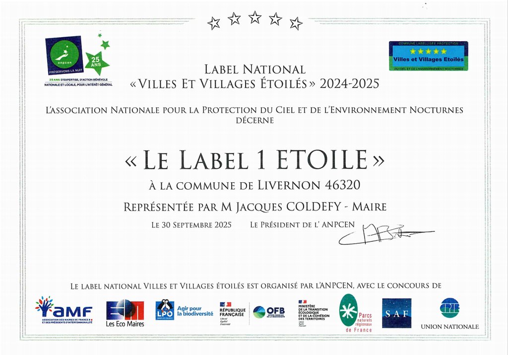 En 2025, Livernon a reçu le label "Villes et Villages étoilés" par l'association Nationale pour la protection du ciel et de l'environnement Nocturne.